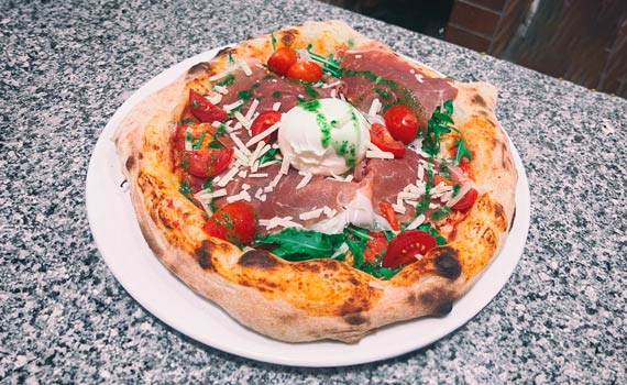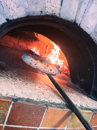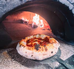 Traditionell gebackene Pizza direkt aus dem Holzofen.